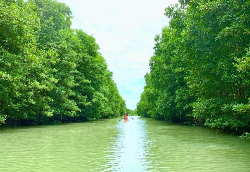 Vào buổi chiều, lịch trình của du khách sẽ di chuyển đến khu sinh thái Cồn Chim, là một ốc đảo nằm lọt thỏm giữa bốn bề xanh ngắt. Màu xanh của mây trời, của nước và của rừng ngập mặn tạo nên một không gian vô cùng trong lành.